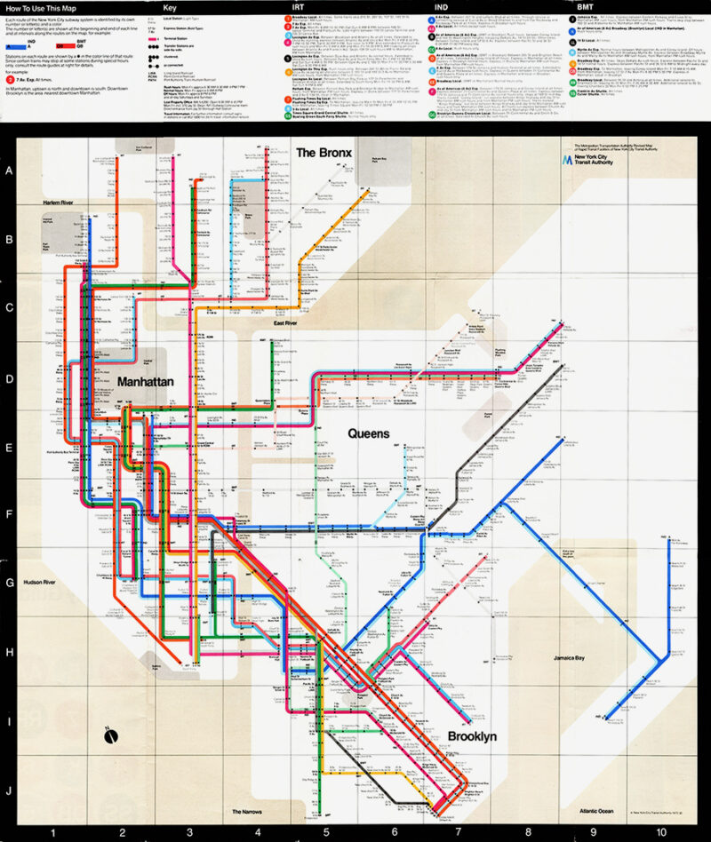 In 1970 Vignelli designed a diagrammatic map for the New York Subway System, following Harry Beck’s design criteria from his London Underground map (1933)—thus using only 45 and 90 degrees lines. In this way the route diagram was simplified and reading the map is self-explanatory. While today this solution is an international standard, at that time passengers felt uncomfortable with a map that didn’t match the real geography, so in 1970 it was dropped and replaced with a conventional map. However, in 2008 Vignelli was invited to design a new diagrammatic map that was later revised in collaboration with his assistants, Beatriz Cifuentes and Yoshiki Waterhouse, and finally adopted as the official map of the New York Subway’s app.